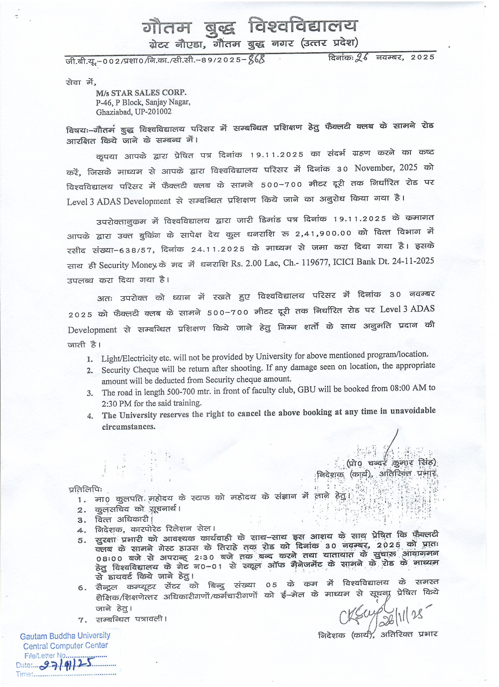 - Regarding the reservation of the road in front of the Faculty Club for examination-related purposes within the Gautam Buddha University campus (28-11-2025 ).