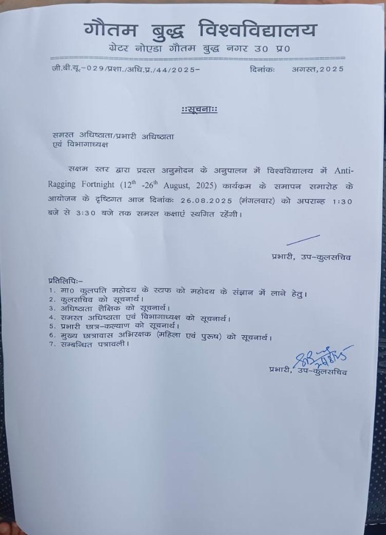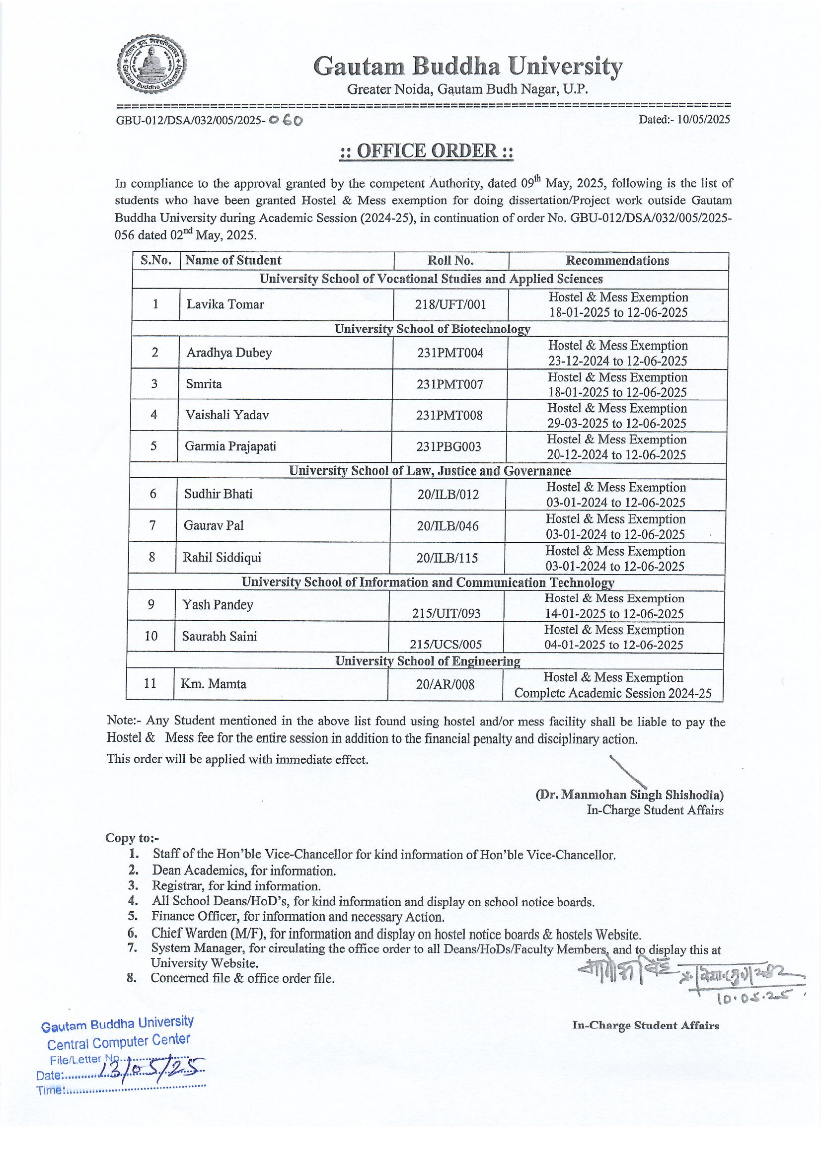 Office Order for Hostel and Mess Exemption for doing dissertation/Project work outside Gautam Buddha University during Academic Session 2024-25