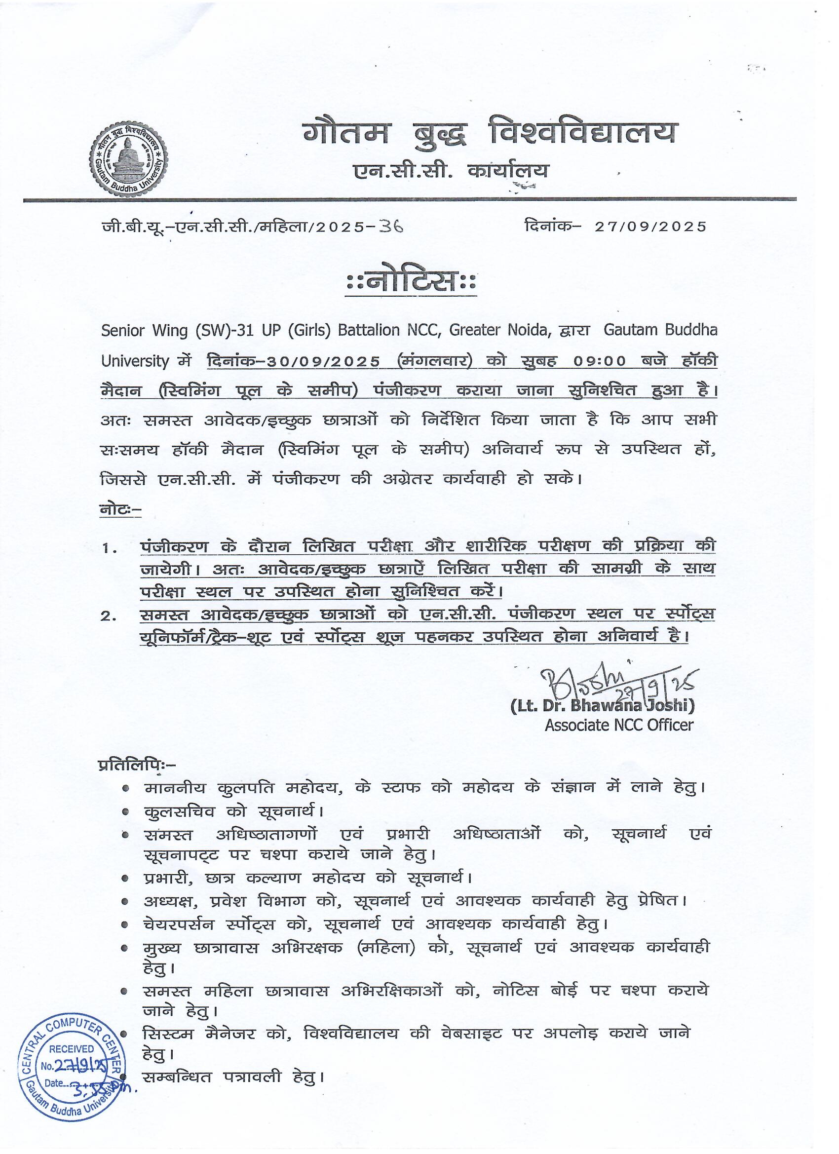 Notice for NCC (Girls) Registration