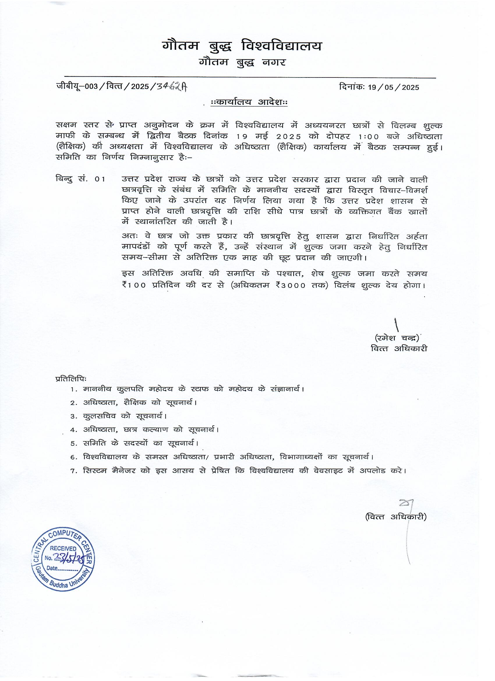 Office Order regarding delay in Fees for GBU students