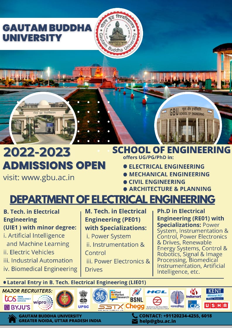 | 27. | EE | M.Tech. Programme in Electrical Engineering (Weekend - for Working Professionals) with specialization in ((i) Instrumentation & Control Engineering (ii) Power Systems (iii) Power Electronics & Drives (iv) Instrumentation & Signal Processing (v) Renewable Energy (vii) Power & Energy Management (viii)Control & Robotics |