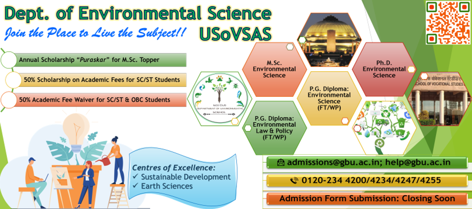 The Department of Environmental Science came into existence under the School of Vocational Studies and Applied Sciences at the Gautam Buddha University in July 2011. At present, the Department offers four (04) academic programs M.Sc. Environmental Science (15 Seats), Ph.D. in Environmental Science (Full Time and Working Professional), Post Graduate Diploma in Environmental Management (Full time/Working Professional, 10 Seats), and Post Graduate Diploma in Environmental Law and Policy (Full time/Working Professional, 10 Seats).